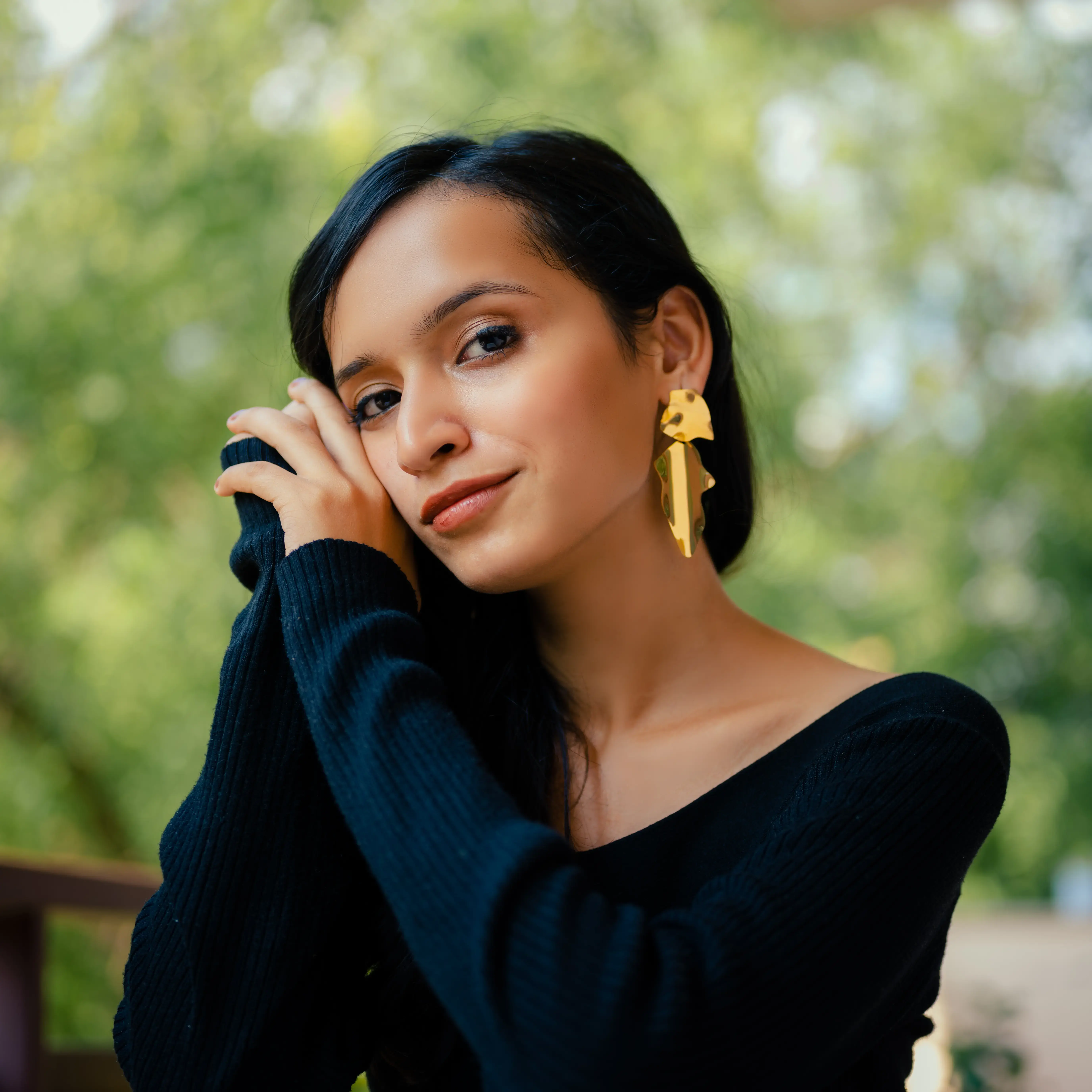 These gold-toned statement earrings feature a fluid, sculptural design that adds a touch of modern elegance to any outfit. Lightweight, bold, and perfect for both festive and contemporary looks.