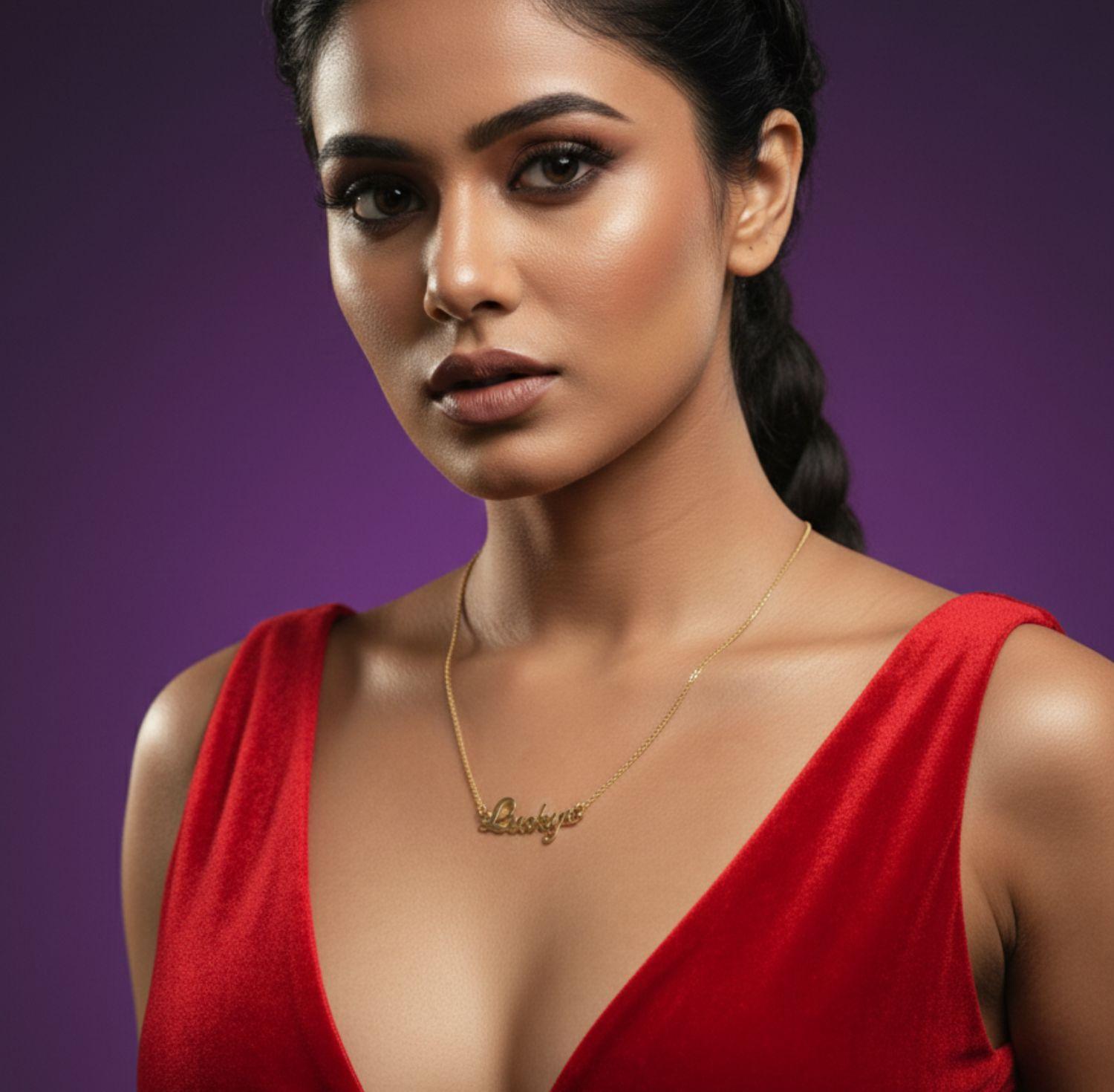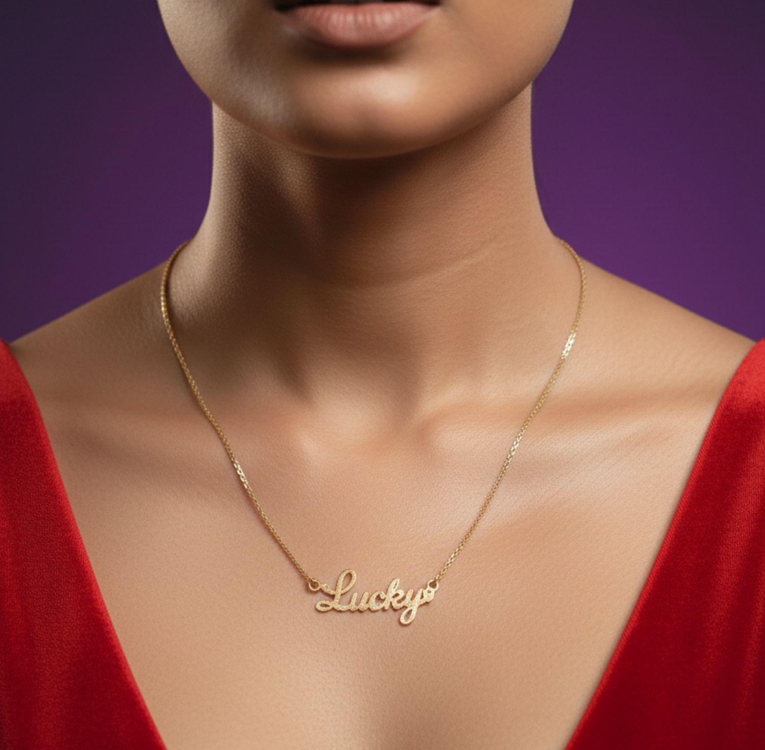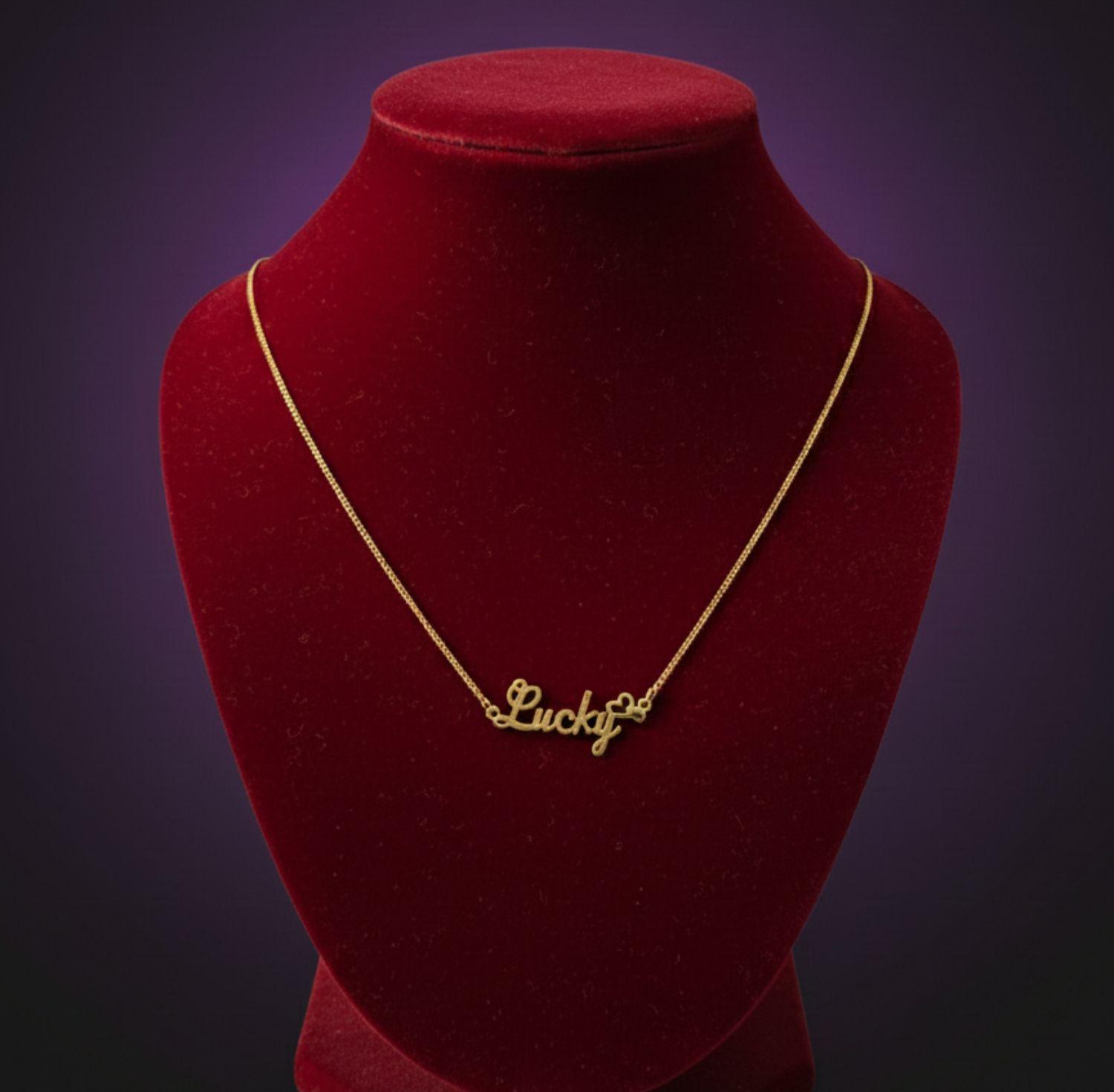 A sleek “Lucky” script pendant crafted with an anti-tarnish gold finish.