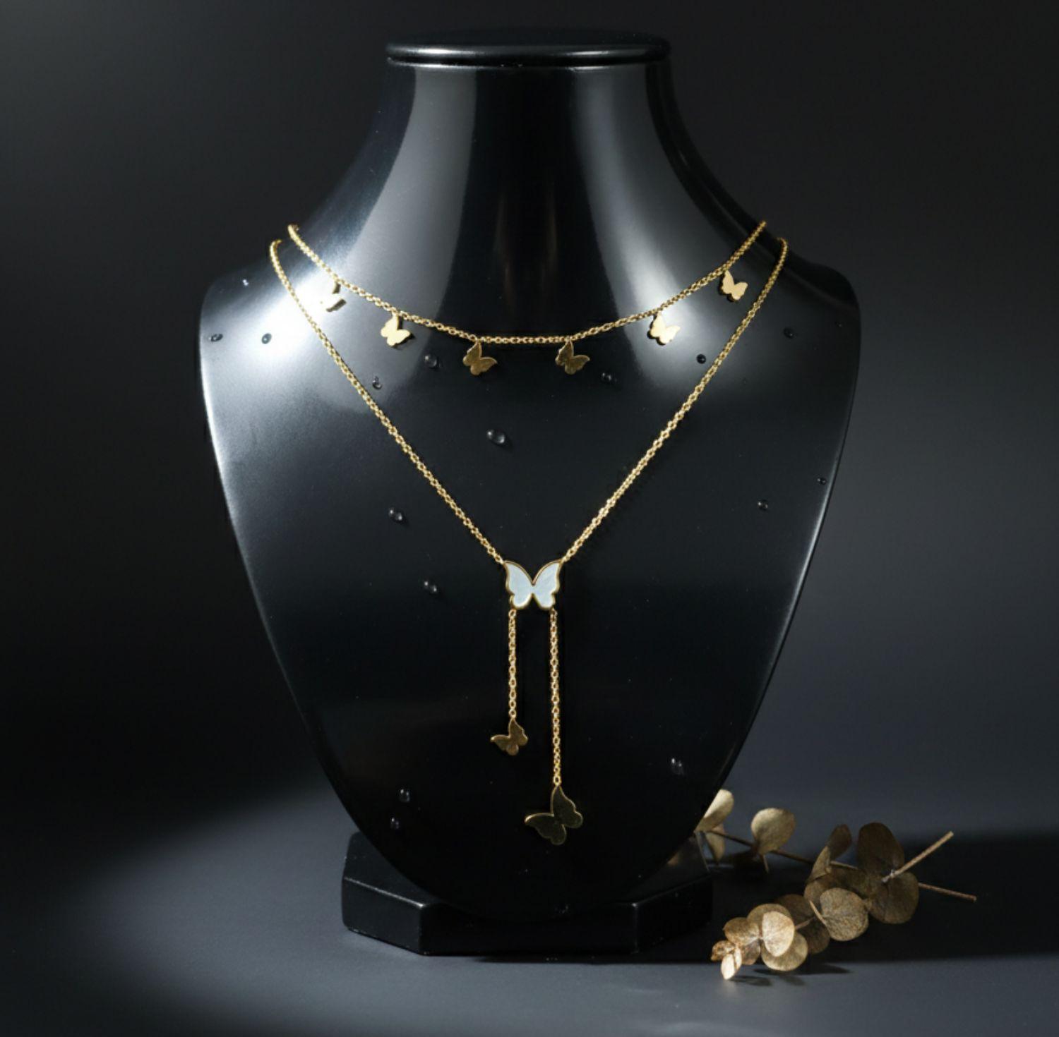 Lightweight butterfly layered necklace with soft gold tones and cascading charm details for everyday elegance.
