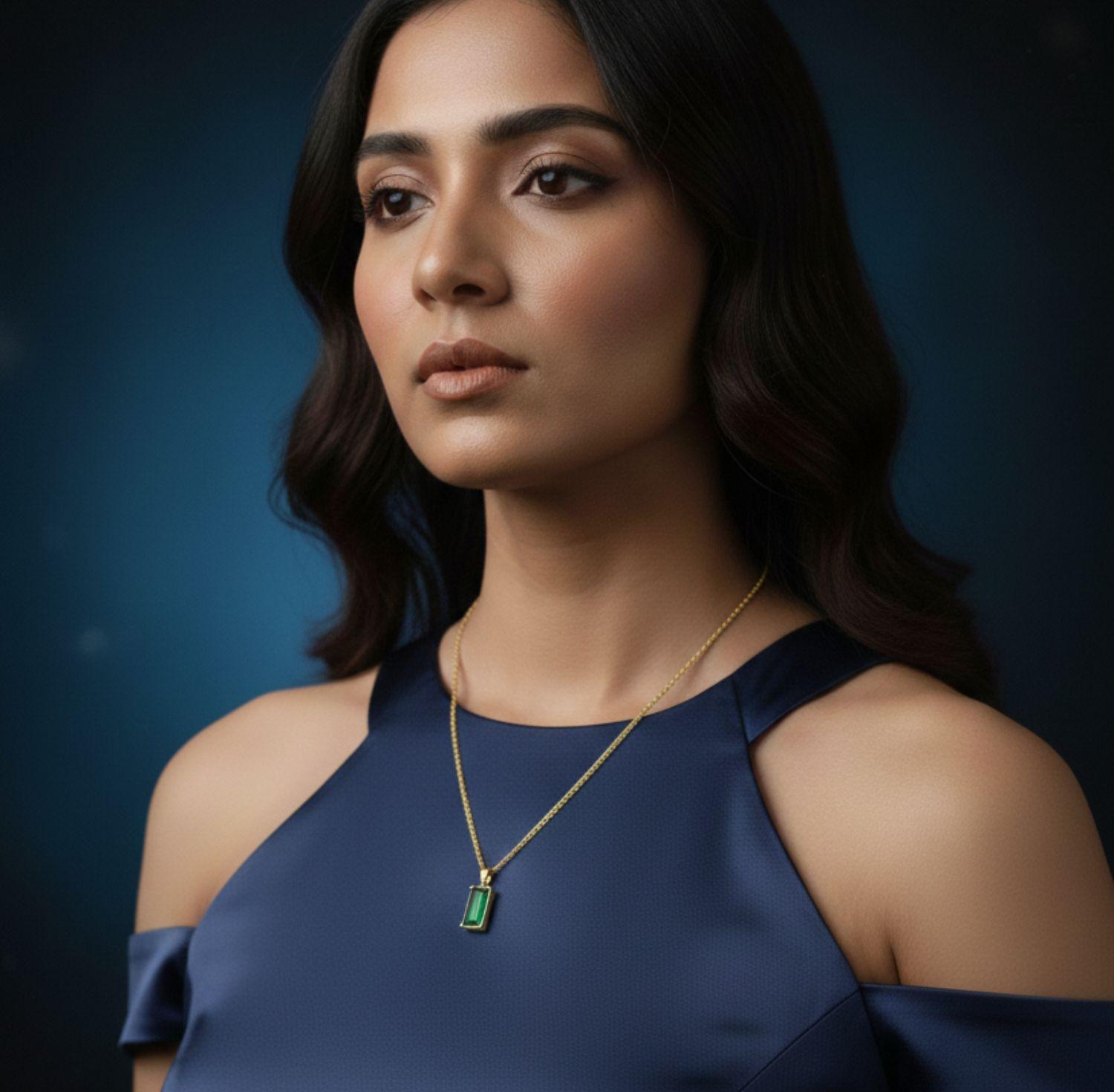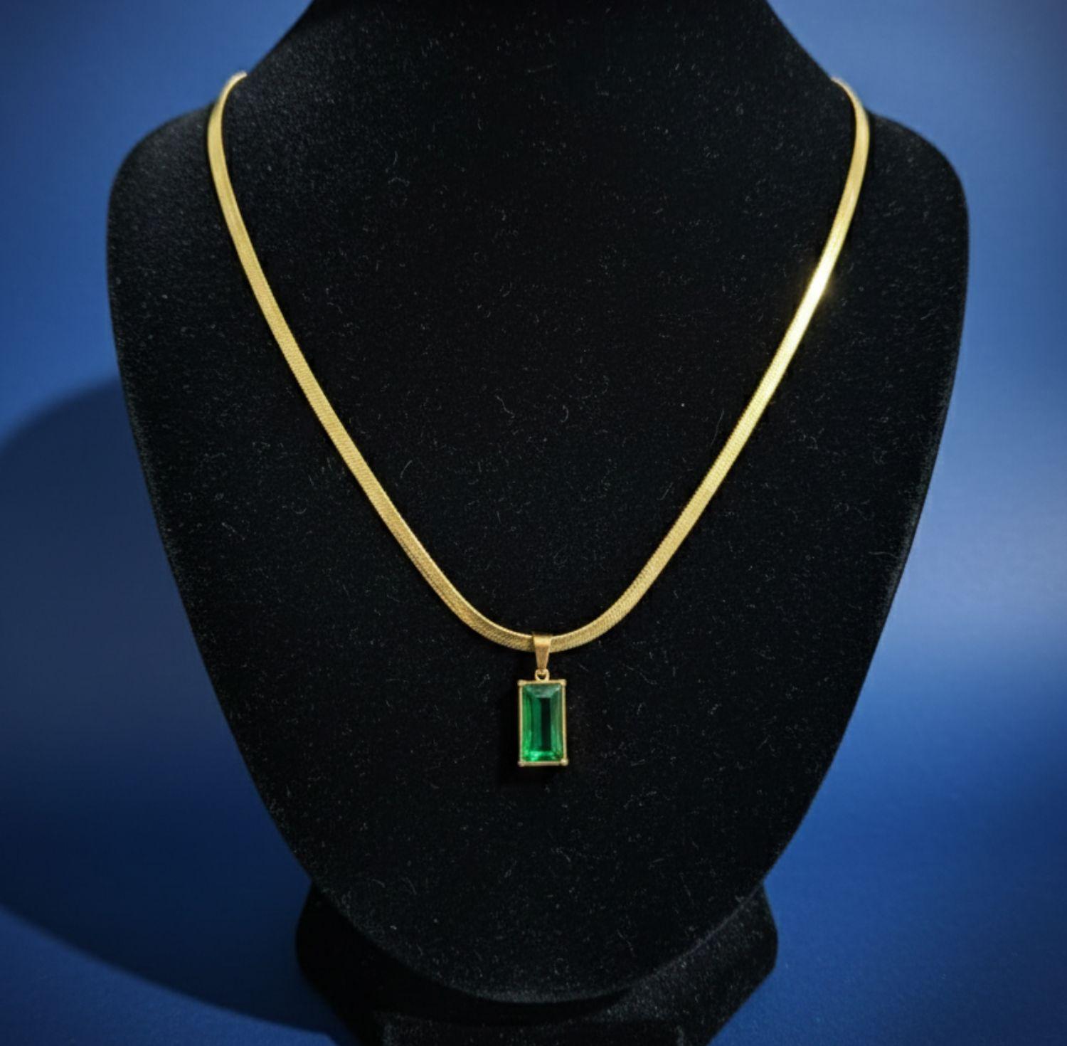 A sleek rectangular green stone pendant set on a gold-finish chain with an anti-tarnish coating.